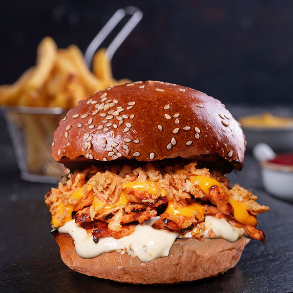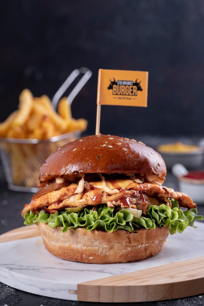 BBQ Chicken Burger İçindekiler:Özel soslar ile marine edilmiş izgara tavuk, barbekü sos, peynir, karamelize soğan, turşu,yeşillik, ve patates kızartması ile. Fiyat:120gr 314₺, 180gr 384₺