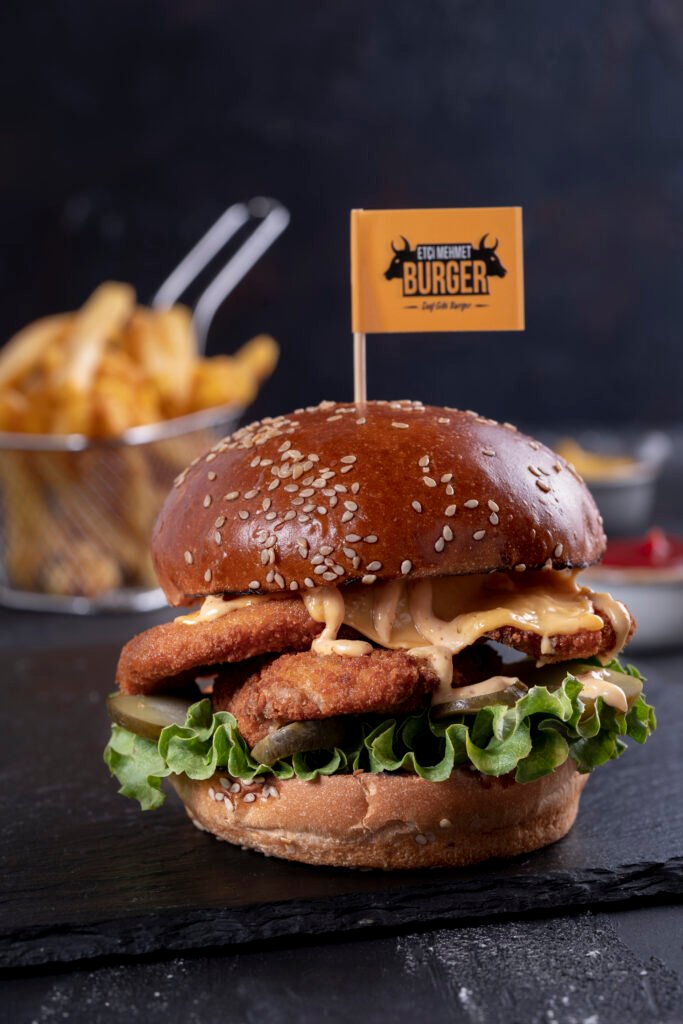 Çıtır Chicken Burger İçindekiler:Özel Paneli Çıtır Tavuk, Peynir, Kuru Soğan, Turşu, Yeşillik, Etçi Mehmet Özel SOS ve Patates Kızartması ile Fiyat:120gr 329₺, 180gr 399₺