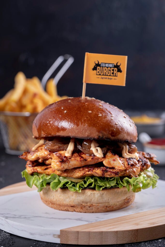 Mexican Çıtır Tavuk Burger İçindekiler:Özel Paneli Çıtır Tavuk, Peynir, Kuru Soğan, Turşu, Yeşillik, Etçi Mehmet Özel Sos, Jalapeno Biber, Közlenmiş Kırmızı Biber, Acı Sos ve Patates Kızartması ile Fiyat:120gr 329₺, 180gr 399₺