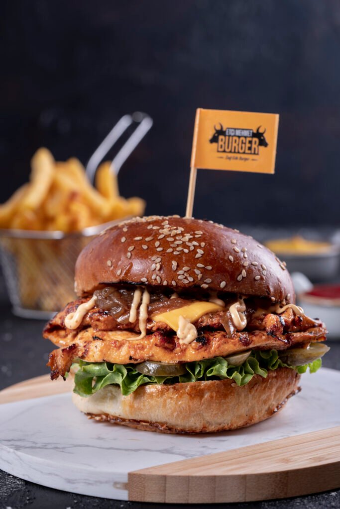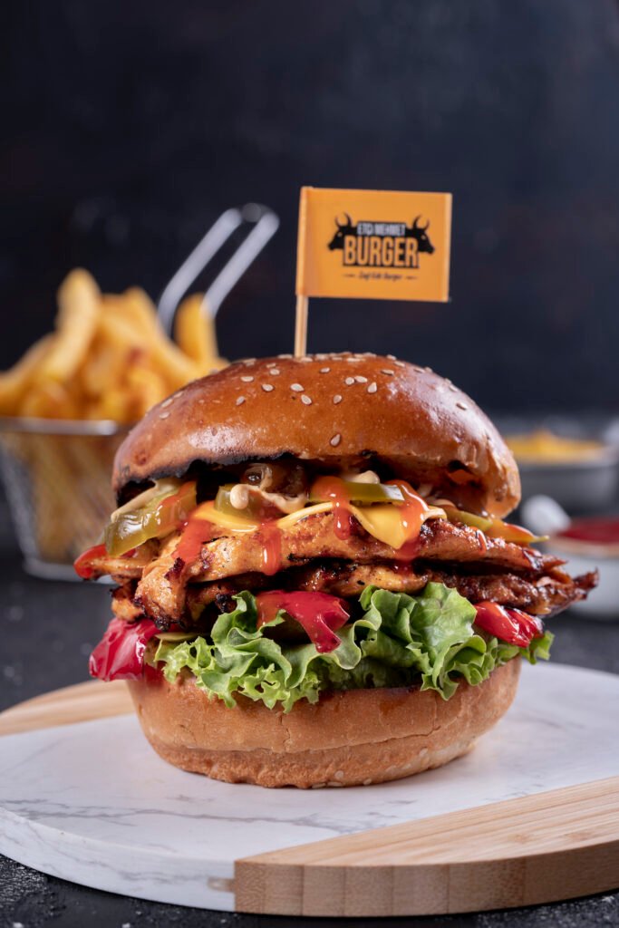 Acılı Chicken Burger İçindekiler:Özel soslar ile marine edilmiş izgara tavuk, Jalapeno biber, Közlenmiş kırmızı biber, peynir, karamelize soğan, turşu,yeşillik,acı sos ve patates kızartması ile. Fiyat:120gr 329₺, 180gr 399₺