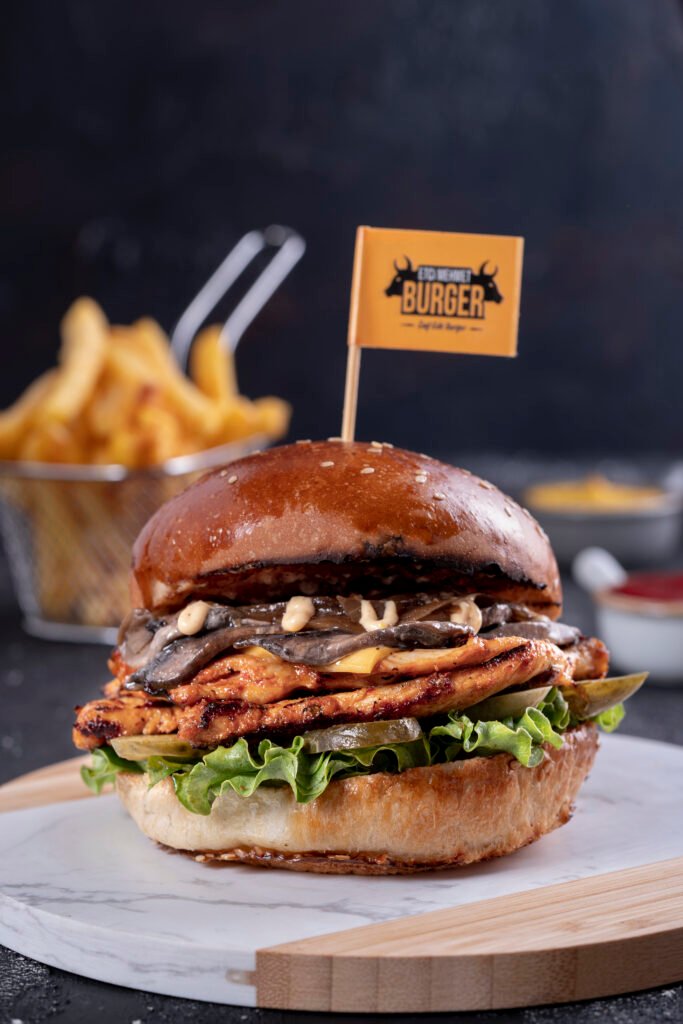 Mushroom Chicken Burger İçindekiler:Özel soslar ile marine edilmiş izgara tavuk, kremalı mantar, peynir, karamelize soğan, turşu,yeşillik, ve patates kızartması ile. Fiyat:120gr 329₺, 180gr 399₺