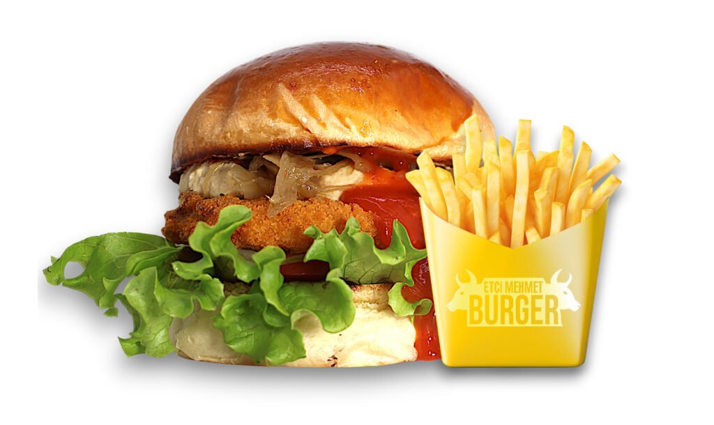 İçindekiler:Özel vegan köfte, cheddar peyniri, karamelize soğan, turşu, yeşillik, burger sosu ve baharatlı patates kızartması ile.