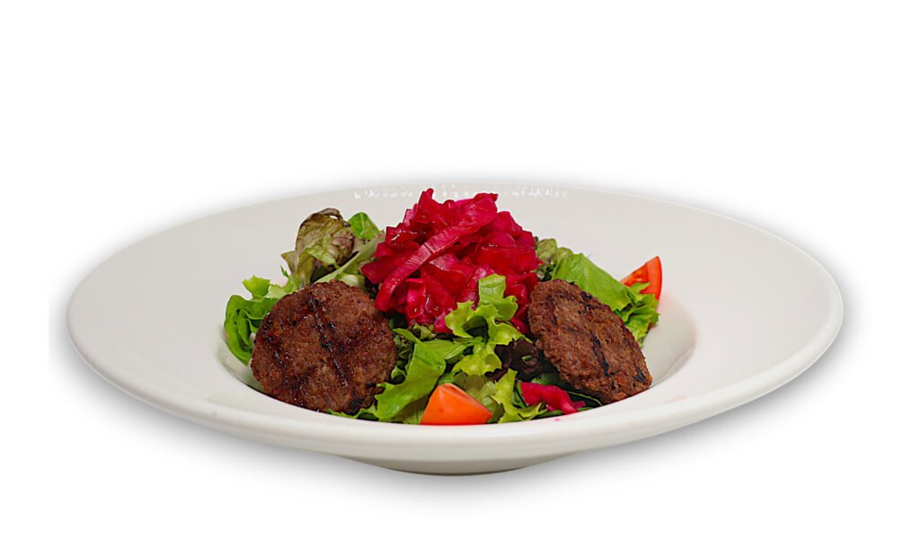 İçindekiler:Taze Akdeniz yeşillikleri üzerinde ızgara vegan köfte parçaları; kırmızı lahana turşusu ve çeri domates eşliğinde.